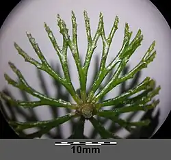 - Igłowate, widlasto (dichotomicznie) podzielone raz lub dwukrotnie. Sztywne za sprawą związków wapnia odkładanych w nich w dużych ilościach. Na brzegach opatrzone rzadkimi, wyraźnymi ząbkami zakończonymi kolcami.