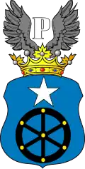 W polu błękitnym koło fortuny czarne, o sześciu szprych z żółtymi ozdobami na dzwonach i na piaście.Nad kołem gwiazda srebrna pięciokątna.U góry korona złota nad którą dwa skrzydła orle szare, pomiędzy którymi litera ruska P.