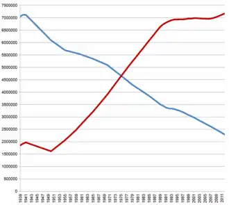 - ↑ Dane zasadniczo dotyczą stanu na początek każdego roku, z wyjątkiem wartości za rok 1959 i 1970 (stan według spisów ludności na dzień 15 stycznia), 1979 (stan według spisu ludności na 17 stycznia), 1989 (stan według spisu ludności na 12 stycznia), 1999 (stan według spisu ludności na 16 stycznia).