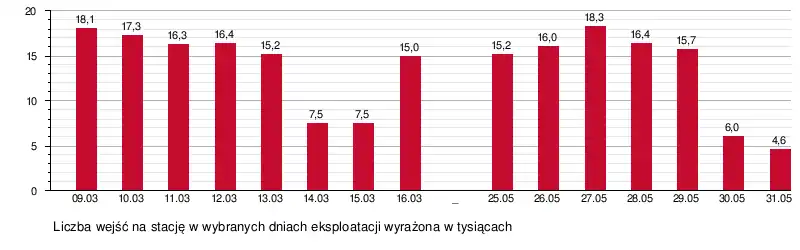 Pod koniec maja 2015, po niespełna trzech miesiącach eksploatacji, liczba pasażerów na linii M2 ustabilizowała się. W ostatnim tygodniu maja 2015 zanotowano wzrost przewozów związany z finałem Ligi Europy, który rozegrano 27 maja na Stadionie Narodowym. Na początku czerwca 2015 stacja była drugą lub trzecią pod względem popularności stacją na zmianę z przystankiem Świętokrzyska[74].