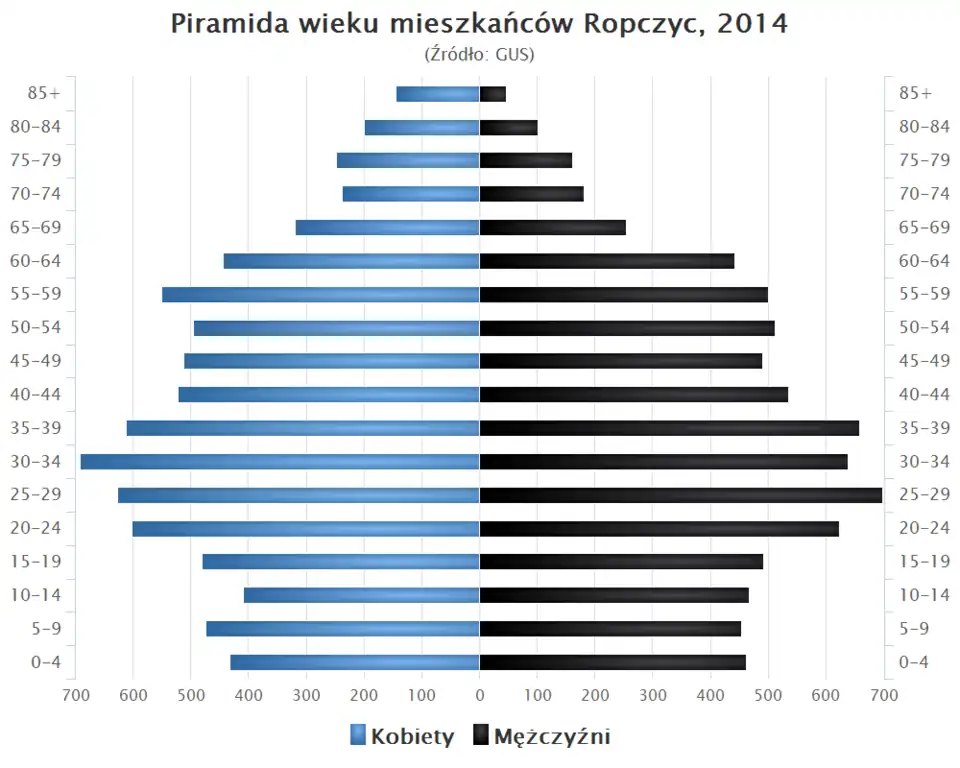 Piramida wieku mieszkańców Ropczyc w 2014 roku[4][21]: