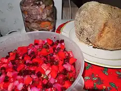 Ugotowane buraki, ziemniaki i marchew są pokrojone w drobna kostkę, dodaje się siekane jabłka, cebulę, Ogórek kiszony, kiszone lub solone śledzie. Poszczególne produkty układa się warstwami w półmisku, każda warstwa jest oprószana solą i pieprzem. Składników nie miesza się, a całość zalewa się sosem przygotowanym z kremowej śmietany, małej ilości octu, bulionu, soli i cukru. Często sałatkę przygotowuje się bez śledzi, są one podawane oddzielnie.