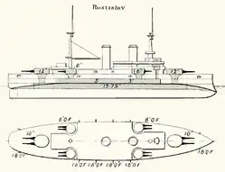Architektura „Rostisława” była typowa dla wczesnych przeddrednotów, z pękatym kadłubem, dziobnicą taranową, gładkim pokładem i uzbrojeniem głównym umieszczonym w dwóch dwudziałowych wieżach na dziobie i rufie. Rzadko spotykaną w tym czasie nowością było rozmieszczenie artylerii średniej 152 mm w czterech dwudziałowych cylindrycznych wieżach na burtach, zamiast w kazamatach. Pomiędzy wieżami głównego kalibru rozciągała się niska nadbudówka, dochodząca do burt na śródokręciu pomiędzy wieżami artylerii średniej (jej ściany stanowiły tam przedłużenie burt wzwyż)[14]. W jej części dziobowej znajdował się mostek, zintegrowany z pancerną wieżą dowodzenia u jego podstawy i z kolumnowym masztem. Na maszcie był umieszczony mars bojowy i nad nim platforma reflektorów. Na początku służby masywna platforma reflektorów znajdowała się wysoko, ponad reją, lecz jeszcze w pierwszym okresie służby została przeniesiona niżej, tuż nad marsem bojowym; zlikwidowano też w tym okresie bocianie gniazdo z masztu rufowego, zapewne w celu redukcji wysoko położonych mas[15]. Charakterystycznym elementem były skrzydła mostka podparte licznymi filarami. Za nadbudówką dziobową znajdowały się dwa proste kominy o okrągłym przekroju, a w części rufowej nadbudówki był drugi maszt z zawieszonym na nim dźwigiem do łodzi[14]. Na samej rufie znajdowała się wewnętrzna galeryjka dla dowódcy[15].