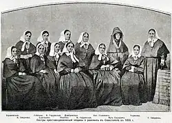 W latach 1854–1856 wspólnota liczyła ok. 250 osób. Niemal wszystkie siostry (wśród nich Katarzyna Bakunina) pomagały chorym i rannym w czasie oblężenia Sewastopola (30 zginęło na skutek ran, 154 zmarły w wyniku chorób)[1]. Jeden z głównych lekarzy, skierowanych do Sewastopola wraz z siostrami miłosierdzia, znany chirurg Nikołaj Pirogow, 22 września 1855 pisał do żony, że do szpitala dociera dziennie do tysiąca rannych, a na jednego lekarza przypada 200 pacjentów – nie jest możliwe ich zbadanie. W tej sytuacji pomoc pielęgniarek była nieoceniona. Bywają formułowane opinie, że była to pierwsza w Europie grupa kobiet, udzielających pomocy medycznej rannym w bitwach[2][b].