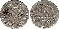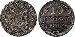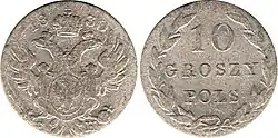 w ołowiu; wzór zgodny z rysunkiem 10 groszy bitych w trakcie powstania listopadowego; produkt eksperymentalny – sklejony z dwóch płytek[4] |