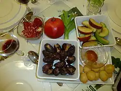 Wieczorem 1 tiszri, w domach rozpoczyna się uczta, podczas której podawane są potrawy związane symbolicznie ze świętem i mające wyrażać szczęście[4][3][9]: okrągła chałka (maczana w miodzie) symbolizująca cykl roku, daktyle, granaty oraz gefilte fisz. Ryba ma być z zachowaną głową, „aby Bóg sprawił, żebyśmy byli głową, a nie ogonem”. Z kolei cząstki jabłka i plastry marchwi, podobnie jak chałka umaczane w miodzie, mają symbolizować szczęśliwy oraz słodki nadchodzący rok[4][7][9].