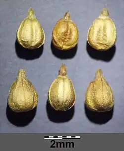 - Kulistawo jajowate niełupki wyróżniające się obecnością poza komorą nasienną, także dwóch dużych, mocno rozdętych komór płonnych, rozdzielonych głęboką bruzdą (bruzda oddzielająca komorę nasienną od komór płonnych jest niewyraźna). Komora nasienna jest na grzbiecie i z boków żeberkowana. Na szczycie owocu znajduje się rąbek kielicha w postaci dużego ząbka. Wraz z rąbkiem owoce osiągają od 2 do 3,2 mm długości i od 1,5 do 2,3 mm szerokości[7].