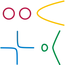 - jednowymiarowe: okręgi, elipsy, parabole i inne krzywe, przy czym nie należą do nich np. lemniskaty, jak lemniskata Bernoulliego (bo mają punkty przecięcia, które nie są lokalnie homeomorficzne z jednowymiarową przestrzenią euklidesową)[b]