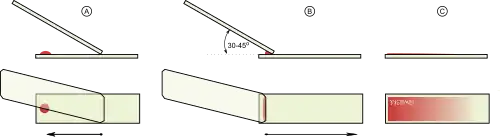 Do przygotowania rozmazu potrzebne są 2 szkiełka podstawowe (przedmiotowe), w tym co najmniej jedno ze ściętymi brzegami. Na szkiełko podstawowe w niedużej odległości od jednego z krótszych brzegów nanosi się kroplę krwi odpowiedniej wielkości, po czym niezwłocznie przykłada się pod kątem 30-45°[5][6] (40-45°[2]) szkiełko ze ściętymi brzegami („rozmazujące”) do szkiełka podstawowego zbierając naniesioną kroplę krwi (na rycinie: A), w taki sposób, aby cały materiał rozprzestrzenił się i wypełnił całą szczelinę między szkiełkami (na rycinie: B). Następnie szybkim, pewnym ruchem bez nacisku przesuwa się szkiełko „rozmazujące” w kierunku dalszego końca szkiełka przedmiotowego, ciągnąc ze sobą krew i uzyskując mierzący 3–4 cm[6][7] rozmaz (⅔ do ¾ długości szkiełka podstawowego[5])[2][5]. Rozmaz suszy się poprzez kilkukrotne szybkie ruchy preparatu w powietrzu i podpisuje danymi identyfikującymi pacjenta (na rycinie: C)[2][6]. Do zabezpieczania rozmazów krwi nie stosuje się szkiełek nakrywkowych[1][8]. Do barwienia przystępuje się – zależnie od źródła – w krótkim czasie po przygotowaniu rozmazu[5], tego samego dnia[6] lub po 24 godzinach suszenia[7].