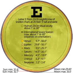 | Księżyc | 29′20″ – 34′6″ | 28–32,5 razy więcej od maksymalnej wartości dla Wenus (pomarańczowy pasek poniżej) / 1760–2046″ |