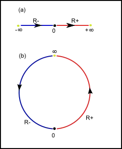 Symbol reprezentuje „punkt w nieskończoności”, w którym zbiegają się oba „końce” rzeczywistej osi liczbowej. Analogiem zespolonym tego rozszerzenia jest konstrukcja sfery Riemanna rozszerzającej zbiór liczb zespolonych przez uzupełnienie jej pojedynczym punktem w nieskończoności, którą nazywa się również zespoloną prostą rzutową i oznacza