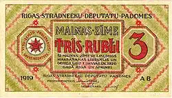 Wkrótce po ogłoszeniu niepodległości przez Łotwę (18 listopada 1918) terytorium kraju znalazło się niemal całkowicie pod okupacją bolszewicką, a rząd łotewski schronił się na kontrolowanym przez Niemców południowo-zachodnim skrawku Kurlandii. W kraju panował chaos na rynku walutowym wywołany sytuacją wojenną, rosnącą inflacją i wieloma innymi czynnikami. W tym okresie na terytorium Łotwy oficjalną walutą była tzw. ostmarka, czyli pieniądz wprowadzony przez Niemców dla terenów okupowanych na wschodzie (Ober-Ost), obejmujących kraje bałtyckie i północno-wschodnie kresy późniejszej II RP. Oprócz marki okupacyjnej w obiegu krążyły również marki Rzeszy Niemieckiej, kilka rodzajów rubla (m.in. tzw. „kierenki”), ) oraz pieniądz zastępczy emitowany przez szereg łotewskich miast, m.in. przez Rygę, Lipawę, Mitawę, Windawę. Ponadto w północnej Łotwie w obiegu znajdowały się marki estońskie, a w Mitawie swój pieniądz emitowała także armia generała Bermondta-Awałowa. 7 kwietnia 1919 r. w opanowanej przez bolszewików Rydze wprowadzono do obiegu rubla łotewskiego emitowanego przez Ryską Radę Przedstawicieli Robotniczych. Stał się on prawnym środkiem płatniczym na terenach łotewskich opanowanych przez bolszewików. Do obiegu wprowadzono cztery banknoty o nominałach: