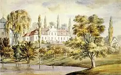 Był to budynek w stylu późnobarokowym, o jedenastoosiowej elewacji, niemal identycznej od strony podjazdu i ogrodu. Jego fasada była zaakcentowana trzyosiowym centralnym ryzalitem, rozczłonkowanym pionowo sześcioma jońskimi pilastrami. Dwa z nich flankowały główną oś z wejściem, pozostałe dwie pary były po bokach ryzalitu. Część centralna domu była dwukondygnacyjna, a skrzydła – parterowe. Nad ryzalitem był trójkątny fronton. Skrajne osie budynku były zaakcentowane boniowanymi pilastrami. Całość była przykryta czterospadowym, gontowym dachem mansardowym. Przed głównym wejściem był obszerny taras, będący jednocześnie podjazdem.
