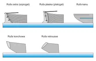 - rufa retrousse – nazywana inaczej rufą odwróconą lub rufą ujemną. Zakończona jest trójkątnym przekrojem nachylonym w kierunku dziobu. To najpowszechniejsze rozwiązanie zarówno wśród jednostek regatowych, jak i turystycznych.