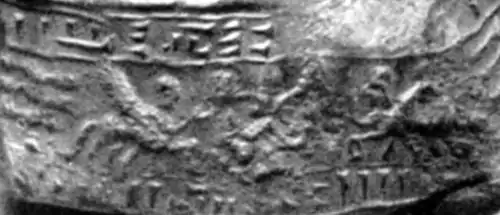 Gliniana plomba przy pomocy sznurka opieczętowywała spichlerz. W celu uniemożliwienia fałszerstwa plomby odbijano na niej przy pomocy pieczęci cylindrycznej podpis stróża. Plomba została znaleziona w 1952 roku na wzniesieniu Karmir Blur podczas wykopalisk archeologicznych w Tejszebaini. Na zdjęciu widoczne są ślady podpisu i pieczęci. |