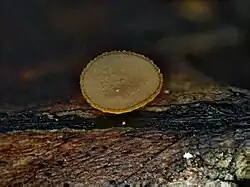 Owocniki typu apotecjum o średnicy do 3 mm z ciemnobrązowym trzonkiem. Powierzchnia hymenialna brązowawa do oliwkowoczerwonej, brzeg ciemniejszy. Askospory 12–17 × 5–6,5 μm, eliptyczne, nerkowate z wieloma gutulami[4].