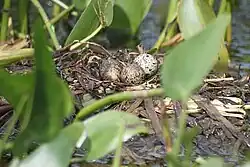 Jaja wysiadywane są przez okres 14–23 dni przez obydwoje rodziców. Samiec wysiaduje rzadziej, ale za to rekompensuje to karmieniem samicy. Rodzice wychowują młode oboje i karmią je, nawet jeśli są już lotne. Pisklęta opuszczają gniazdo jedynie, jeśli grozi im niebezpieczeństwo. Mają rudawożółty puch usiany w czarne plamki. Zdolność do lotu osiągają po 4 tygodniach.
