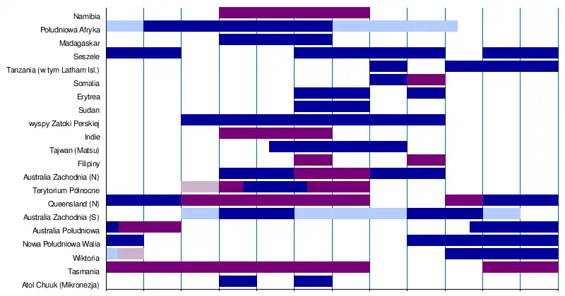 ![]() Mapa występowania według podgatunku. Tereny lęgowe wzdłuż wybrzeży zaznaczono na zielono, pominięto jednak kilka obszarów, m.in. wybrzeża wschodniej Afryki i Madagaskaru | |||