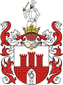 W polu srebrnym mur obronny z blankami, czerwony, na którym trzy takież baszty z blankami; w nim brama, w której mąż zbrojny z mieczem w uniesionej prawicy. Klejnot: mąż zbrojny od pasa jak w godle. Labry czerwone, podbite srebrem.
