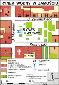 W odróżnieniu od dwóch pozostałych rynków, wspomniana oś, tj. ul. B. Morando, nie przebiega centralnie przez ten rynek i nie przecina go na dwie części - Rynek Wodny ma kształt prostokąta, zajmuje teren na wschód od tej ulicy (od północy ograniczony jest ul. S. Żeromskiego, od południa ul. T. Kościuszki, od wschodu zabudową przy ul. Bazyliańskiej), o wymiarach 50 na ok. 65 metrów.