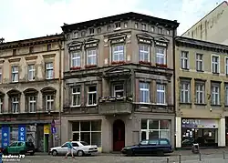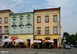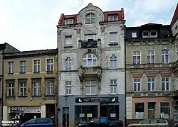- Kamienica (Rynek 17) – z końca XIX wieku w stylu neorenesansu[65]; jest to budynek mieszkalno-usługowy; trójkondygnacyjny[63], wybudowany na planie lekko załamanej litery „L”; charakterystycznym elementem kamienicy jest obszerny wykusz w rogu budynku z obramowaniem okiennym w postaci kolumn, a ponadto na elewacji znajdują się pilastry również jako forma obramowania okien[65],