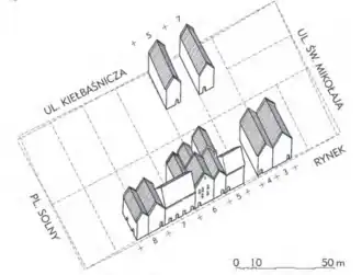 Parcele wokół rynku zostały podzielone na trzydzieści sześć równych kurii mieszczańskich: po dziesięć na pierzejach północnej i południowej oraz po osiem na pierzejach zachodniej i wschodniej. Każda parcela miała 60 stóp szerokości (18,78 m), a ich głębokość wynosiła 120 stóp (37,56 m) dla pierzei krótszych i 240 stóp (75 m) dla pierzei dłuższych[16]. Jerzy Piekalski podzielił wytyczone działki na pięć stref[e]: