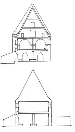 Domy murowane były najczęściej dwu-[88], rzadziej trzykondygnacyjne, a ich przyziemia były posadowione w gruncie na głębokości od ok. 0,6 do 1 metra (a maksymalnie do 1/3 swej wysokości)[15][89], by już pod koniec XIII wieku być całkowicie pogrążone w ziemi. Wówczas takie pomieszczenia przykrywano sklepieniami[90][83][26][j]. Pierwsze kondygnacje miały zazwyczaj od 2,6 do 3,2 metra wysokości i były to ogrzewane pomieszczenia mieszkalne. W niektórych domach drugie kondygnacje miały do 4,5 metra wysokości, co mogło świadczyć o ich przeznaczeniu reprezentacyjnym lub magazynowym[83]. Pomieszczenia na pierwszych kondygnacjach były oświetlane przez okna szczelinowe, a wyższe kondygnacje oświetlały większe okna jedno- lub dwustronnie rozglifione, nakryte łękami półkolistymi lub zaostrzonymi, oraz okulusy[90]. Fasady pierwszych kamienic składały się z niezależnych od siebie kompozycyjnie części podzielonych fryzem płycinowym lub gzymsem. W budynkach jednopasmowych wejście znajdowało się na skraju elewacji i prowadziło najczęściej do sieni, w kamienicach dwupasmowych znajdowały się dwa wejścia obok siebie przy jednej ze ścian bocznych. Parterowa część fasady miała najczęściej kompozycję horyzontalną z wyraźnym podziałem okiennym i z imitującymi je blendami[91][92].