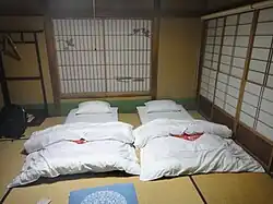 W pokojach gościnnych podłogę pokrywają maty tatami. Wyposażenie pokoju gościnnego stanowi niewielki, niski stół (tsukue), przy którym goście mogą wypić herbatę i zjeść posiłek. Wokół stolika są rozłożone poduszki do siedzenia (zabuton). Przeważnie na posiłki goście zapraszani są do wspólnej sali, w której przy takich samych niewysokich ławach podawane są japońskie i – w miarę możliwości gospodarzy lub prezentowanej oferty – europejskie potrawy.
