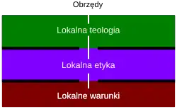 Obrzędy zależą od szeregu czynników, które dla rozjaśnienia sprawy można nazwać warstwami (przedstawione na grafice obok). A zatem poczynając od źródła: warunki w plemieniu (liczba osób, miejsce bytowania, klimat, dostępność pożywienia i wiele innych) kształtują – a potem wręcz narzucają – odpowiednią etykę, która systematyzuje, reguluje i stabilizuje życie społeczne. To przekłada się zaś na subiektywne pojmowanie świata (etyka bowiem, stanowi dla znającego pojęcie, ale niebędącego biegłym w socjologii czy antropologii artefakt JEGO własnej tradycji – działa to na zasadzie "Co zastałem, to pielęgnuję, uważając za prawidłowe i normalne"), implikujące daną teologię, która z kolei implikuje określone obrzędy.
