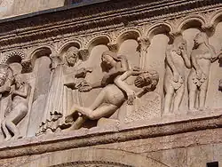 Już ok. 1100 powstały pierwsze dzieła dużej rangi artystycznej[18], wykonane przez Wiligelma: dekoracja rzeźbiarska katedry w Modenie. Na fasadzie zachodniej zachowały się cztery płyty, tworzące pierwotnie fryz z jego reliefami, przedstawiającymi Boga Ojca, stworzenie Adama i Ewy, grzech pierworodny; sąd nad grzesznikami, wygnanie z raju i dalsze ich losy; historię Kaina i Arkę Noego. Są to płaskorzeźby o charakterze wyłącznie figuralnym, pozbawione tak chętnie wcześniej stosowanych plecionek, co świadczy o zwrotowi rzeźby romańskiej ku antykowi. Portal katedry także został ozdobiony rzeźbami Wiligelma – prorokami, stojącymi w jego węgarach. Sam portal został wysunięty przed fasadę, a jego kolumny wsparto na dwóch antycznych lwach.