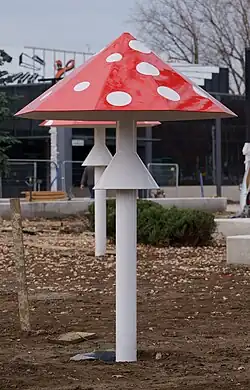 Muchomory II to trzy rzeźby siedziska wykonane z polichromowanego metalu i drewna. Zostały dofinansowane ze środków Ministra Kultury i Dziedzictwa Narodowego oraz NCK[7]. |