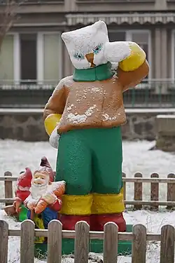 autor nieznany | lata 60./70. XX w. | Rzeźba Dziewczynka, Przedszkolak lub Ania. Rzeźba na niskim cokole wykonana jest ze sztucznego kamienia, przedstawia dziewczynkę ubraną w sukienkę. Według lokalnej anegdoty jest to dziecko, którego rodzice nie odebrali na czas z przedszkola | [3][4] |