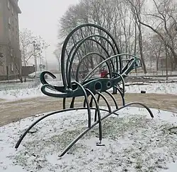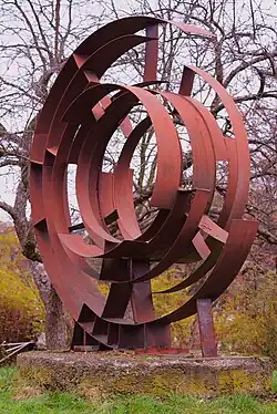 Antoni Hajdecki | 1974 | Rzeźba Spirala kosmiczna. Kompozycja wykonana jest z metalu. Paski blachy połączone poprzeczkami zapętlają się w fantazyjną spiralę. Rzeźba symbolizuje popularny w latach 70. XX w. temat podboju kosmosu | [3][4] |