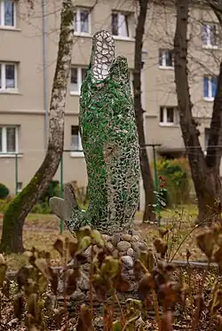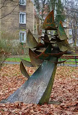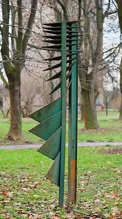 Lucjan Orzech | 1978 | Rzeźba Ptaki potocznie zwana Choinką wykonana jest z metalu. Składa się z lekko wygiętych trójkątów ułożonych pod różnymi kątami, które osadzone są na postumencie w kształcie wygiętego ostrosłupa, niektóre łączą się między sobą. Widoczne pozostałości farby zielonej, niebieskiej i żółtej | [3][4] |