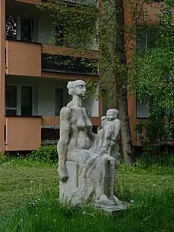 Wiesław Bielak | 1974 | Rzeźba Macierzyństwo. Przedstawia siedzącą kobietę z dzieckiem na lewym kolanie. Kompozycja wykonana została z wapienia pińczowskiego. W 2017 r. rzeźba poddana została renowacji | [3][4] |