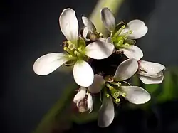 - Ledwie widoczne, niepozorne, białe i nierozchylone (proste). Pręcików 4. Działki kielicha wąskie i eliptyczne, 1,5 do 2,2 mm długie, zielone, niekiedy fioletowo nabiegłe. Płatki korony wąskie, klinowato zakończone do 4 mm długie.