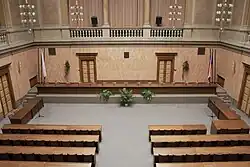 Budowla stylistyką nawiązuje do osiągnięć tzw. północnego renesansu. Oryginalny projekt budowy uwzględniał potrzeby i funkcje Parlamentu Moraw. Budynek ma kształt prostokąta z 4 dziedzińcami po wschodniej stronie budynku i dwukondygnacyjną aulą znajdująca się po zachodniej stronie budynku. Aula jest miejscem, gdzie obecnie przeprowadza się posiedzenia Sądu. Pomieszczenie przylegające do przedsionka i otoczone innymi mniejszymi pomieszczeniami początkowo była restauracją przeznaczoną dla posłów i klubów poselskich, jednak obecnie pełni rolę sali konferencyjnej. Ściany auli są pokryte syntetycznym czerwonym marmurem, wykończone fryzem, a sklepienie jest pokryte malowidłami przedstawiającymi ziemię. Dodatkowym elementem auli są loże z balustradami[10].