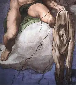 - ↑ Jedynie fragment ciemnej szaty nie pasującej do całości, a okrywającej przyrodzenie, jest późniejszym efektem cenzury; wykonany został techniką al secco.