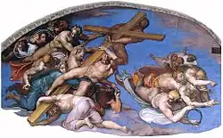 Prace nad freskiem Michał Anioł rozpoczął od góry, od łukowych partii – lunet. Tam przedstawił postacie aniołów trzymających atrybuty męki Pańskiej: krzyż, koronę cierniową, słup, przed którym biczowano Jezusa i włócznię. Postacie zostały przedstawione odmiennie od dotychczas przyjętych kanonów. Nie posiadają skrzydeł, aureoli czy miłych dziecięcych twarzy, ale muskularne i delikatne rysy młodzieńców. Pierwotnie ciała chłopców, poskręcane, przyjmujące wyraziste pozy i gesty, były całkowicie nagie[5]. Po lewej stronie aniołowie skupieni są wokół krzyża. Każdy z nich przedstawia pewien etap ukrzyżowania. Anioł odziany w zieloną szatę obejmuje krzyż, uosabiając tym samym ludzką drogę do dnia Sądu Ostatecznego, podczas której człowiek pokładający nadzieję w krzyżu Chrystusa unika sądu. Kolor jego szaty jest kolorem nadziei. Za nim widoczny jest anioł w szacie szafranowej, symbolizującej rozeznanie duchowe zbliżające ludzi do krzyża. W dolnej części krzyża widoczna jest inna postać ubrana w fioletową szatę. Ten kolor, w połączeniu z bielą, symbolizuje wiarę i pokutę. Pozostali dwaj zostali ubrani w białą koszulę i czerwono-zielony płaszcz. Kolory są symbolem odpowiednio: wiary, nadziei i miłości. Wszystkie barwy oznaczają więc cnoty potrzebne do uznania krzyża jako narzędzia zbawienia. Dwaj aniołowie opierają się o symbol męki, co przy ich nagości tylko potęguje ich wiarę w zbawienie i poddanie się symbolowi męki. Obok po prawej stronie znajduje się grupa czterech aniołów lecących w kierunku środka. Jeden z nich ogląda się za siebie, trzymając w ręku koronę cierniową z bardzo małymi kolcami. Obok niego znajduje się inny anioł w szafranowym okryciu na brzuchu i nogach, z jednym tylko gwoździem w ręku. Obok niego inny, w płaszczu w barwach jasnej zieleni i żółci, blokuje przedramię trzeciego anioła, a prawą chwyta gwóźdź, chcąc niejako przebić nim dłoń towarzysza. Ten z kolei unosi prawe ramię i wskazuje na swoją lewą dłoń, która ma być przebita gwoździem. Za tą grupką Michał Anioł umieścił trzy głowy koło siebie oraz nieco odsuniętą czwartą postać w białej szacie[6].