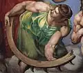 Dwie lunety są oddzielone od dolnej części fresku pasmem obłoków. Pod nimi malarz umieścił niebo sędziów i królów Izraela, tworzącą krąg nad głową Chrystusa. Postać w czerwonym ubraniu to anioł, który wskazuje Mojżesza, mającego czapkę z dwoma rogami i palcem wskazującym w górę napominając króla Dawida (żółta czapka)[17]. Po lewej stronie, nad karząca dłonią Chrystusa widoczny jest anioł z nogami okrytymi fioletową szatą pokutną i z czepkiem na głowie w błękitnej barwie oznaczającą kontemplację. Anioł w czerwonej szacie wskazuje na Mojżesza, a nad nim widoczny jest kolejny w jasnoszarym płaszczu. Nad niebiańską postacią w niebieskim czepku widoczna jest para złączona w miłosnym uścisku. Jest to nierządnica z Jerycha, Rachab i jej mąż Salmon. Za nimi malarz umieścił Aminadaba i Nassona. Wśród postaci będącymi przodkami Jezusa zgodnie z Ewangelią Mateusza można rozpoznać Dawida, Batszebę i Salomona. Nieco po prawej stronie widzimy w zielonej szacie z uniesionym palcem Mojżesza, a obok niego króla Dawida, którego karci za związek cudzołożny z Batszebą. Przy aniele w czerwonej szacie wskazującym na Mojżesza widoczne są kolejne postacie ze Starego Testamentu, będące zarazem przodkami Chrystusa. Jest to Noemi, jej mąż Elimelek i Rut z jej pierwszym mężem Kilionem, będąca prababką Dawida. Obok mężczyzny w czerwonej szacie z tonsurą na głowie, Jeftego, stoi wpatrzona w niego kobieta z wiankiem z kwiatów na głowie. Jest to córka Jeftego, która została złożona w ofierze przez ojca w wyniku nierozsądnego ślubowania. Przy Jeftym Michelangelo umieścił sędziów starotestamentowych: brodata postać to Samuel, a w jasnofioletowej szacie przedstawiony został Jozue[18].