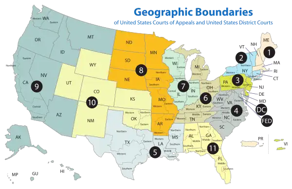 Poniższa mapa pokazuje podział USA na federalne dystrykty sądowe i okręgi apelacyjne: