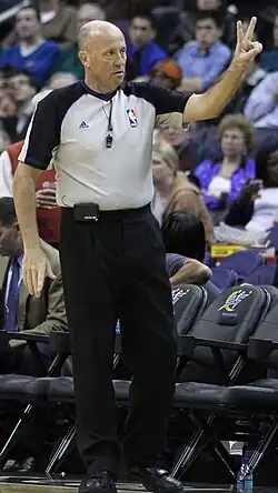 Gdy piłka dotknie sędziego, uznawane jest to za dotknięcie piłki o parkiet w miejscu, w którym stoi sędzia – jeśli sędzia stoi na aucie, jest to aut; gdy sędzia stoi na boisku, gra nie jest przerywana.