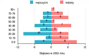 Współczesna struktura demograficzna wioski Słajkowo na podstawie danych z lat 1995–2009 według roczników GUS-u, z prezentacją danych z 2002 roku[9]: