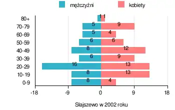 Współczesna struktura demograficzna wioski Słajszewo na podstawie danych z lat 1995–2009 według roczników GUS-u, z prezentacją danych z 2002 roku[10]: