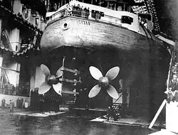 | 2 pionowe maszyny parowe potrójnego rozprężania o mocy kontraktowej 15 800 KM, 20 kotłów parowych | |