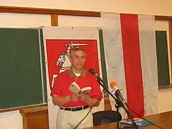 Od 1993 roku wchodził w skład partii Białoruski Front Ludowy. W 1994 założył radykalnie prawicową[1], nacjonalistyczną[5] białoruską grupę „Prawy Rewansz” (pol. Rewanż Prawicowy). W kwietniu 1996 roku został aresztowany w związku ze wszczęciem sprawy kryminalnej nr 182. Formalnym powodem zatrzymania był napisany przez niego[1] w listopadzie 1995 roku[2] rosyjskojęzyczny wiersz pt. Ubiej priezidienta (pol. Zabij prezydenta)[1], opublikowany w witebskiej gazecie „Wybar” (pol. Wybór)[6]. W areszcie 8 dni prowadził protest głodowy[1]. Skazano go za wzywanie do bezprawnej zmiany władzy, bezprawne przekroczenie granicy państwowej oraz bezprawne noszenie broni białej[7]. Stał się tym samym pierwszym w historii niepodległej Białorusi literatem skazanym za swój utwór[3]. W więzieniu spędził dziesięć miesięcy[2]. Dzięki poparciu społecznemu i wstawiennictwu grupy rosyjskich pisarzy (Dmitrija Lichaczowa, Andrieja Wozniesienskiego, Belli Achmaduliny, Andrieja Bitowa, Bułata Okudżawy, Fazila Iskandera, Anatolija Pristawkina i innych) 7 lutego 1997 roku został uwolniony[6] pod rygorem zakazu opuszczania kraju[2]. Po wyjściu z więzienia, podczas jednej z manifestacji[1] w sierpniu 1997 roku[2] wyraził sprzeciw wobec władz Białorusi[2] publicznie zaszywając sobie usta[7]. Od 1999 roku jest członkiem Związku Pisarzy Białoruskich[1].