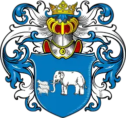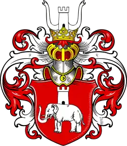 Słoń II: W polu czerwonym słoń srebrny z takąż wieżą blankowaną na grzebiecie. W klejnocie, między dwiema trąbami słoniowymi, wieża jak w godle. Labry czerwone, podbite srebrem.