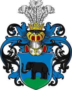 Słoń: W polu błękitnym, na trzech pagórkach zielonych, słoń srebrny. Klejnot: nad hełmem, w koronie trzy pióra strusie. Labry: błękitne, podbite srebrem.