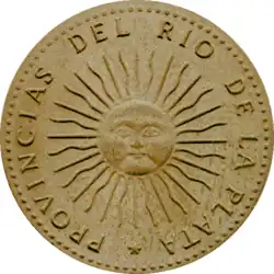 Słońce , zwane Słońcem Majowym, jest repliką grawerunku z pierwszej argentyńskiej monety , zatwierdzonej w 1813 r. przez Zgromadzenie Konstytucyjne , której wartość wynosiła osiem escudo (nominał hiszpańskiej waluty).