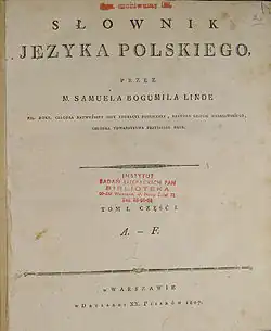 Oświecenie wśród naczelnych postulatów ówczesnej polityki językowej umieściło opracowanie słownika narodowego i gramatyki ojczystego języka. Gramatyka powstała pod piórem Onufrego Kopczyńskiego, słownik natomiast nie doczekał się urzeczywistnienia. Dopiero na początku XIX wieku, w latach 1807–1814, ukazało się w Warszawie sześciotomowe dzieło. Jego autorem był Samuel Bogumił Linde. Słownik Lindego stanowi największy przełom w dziejach polskiej leksykografii. Jest pierwszym słownikiem opartym niemal wyłącznie na materiale wyrazowym drukowanych tekstów literackich, publicystycznych, naukowych itp. Zestaw źródeł słownika obejmuje około 800 druków – od połowy XVI do początków XIX wieku, jest to więc pierwszy polski słownik historyczny. Równocześnie obrazuje stan polszczyzny początku XIX wieku w zakresie słownictwa. Materiał wyrazowy druków uzupełnił autor przykładami zaczerpniętymi ze współczesnego języka mówionego. Układ słownika jest alfabetyczno-gniazdowy: w jednym obszernym artykule hasłowym gromadzi Linde obok wyrazu podstawowego wszystkie wyrazy odeń pochodzące, jeśli nie przeciwstawia się temu porządek alfabetyczny. Na opracowanie wyrazu hasłowego składa się niezbędna informacja gramatyczna, liczne odpowiedniki obce wyrazu hasłowego, objaśnienie znaczenia wyrazu hasłowego oraz liczne przykłady jego użycia wypisane z przejrzanych druków. Każdy cytat opatrzony jest w słowniku skrótem nazwiska autora, tytułu dzieła i numerem strony. W czasach Lindego było to przedsięwzięcie rewolucyjne. Słownik Lindego liczy ok. 60 tys. haseł. Wydrukowany w zbyt małej liczbie egzemplarzy, szybko stał się niedostępny na rynku księgarskim. W latach 1856–1860 we Lwowie ukazało się drugie wydanie staraniem Zakładu Narodowego im. Ossolińskich[2].